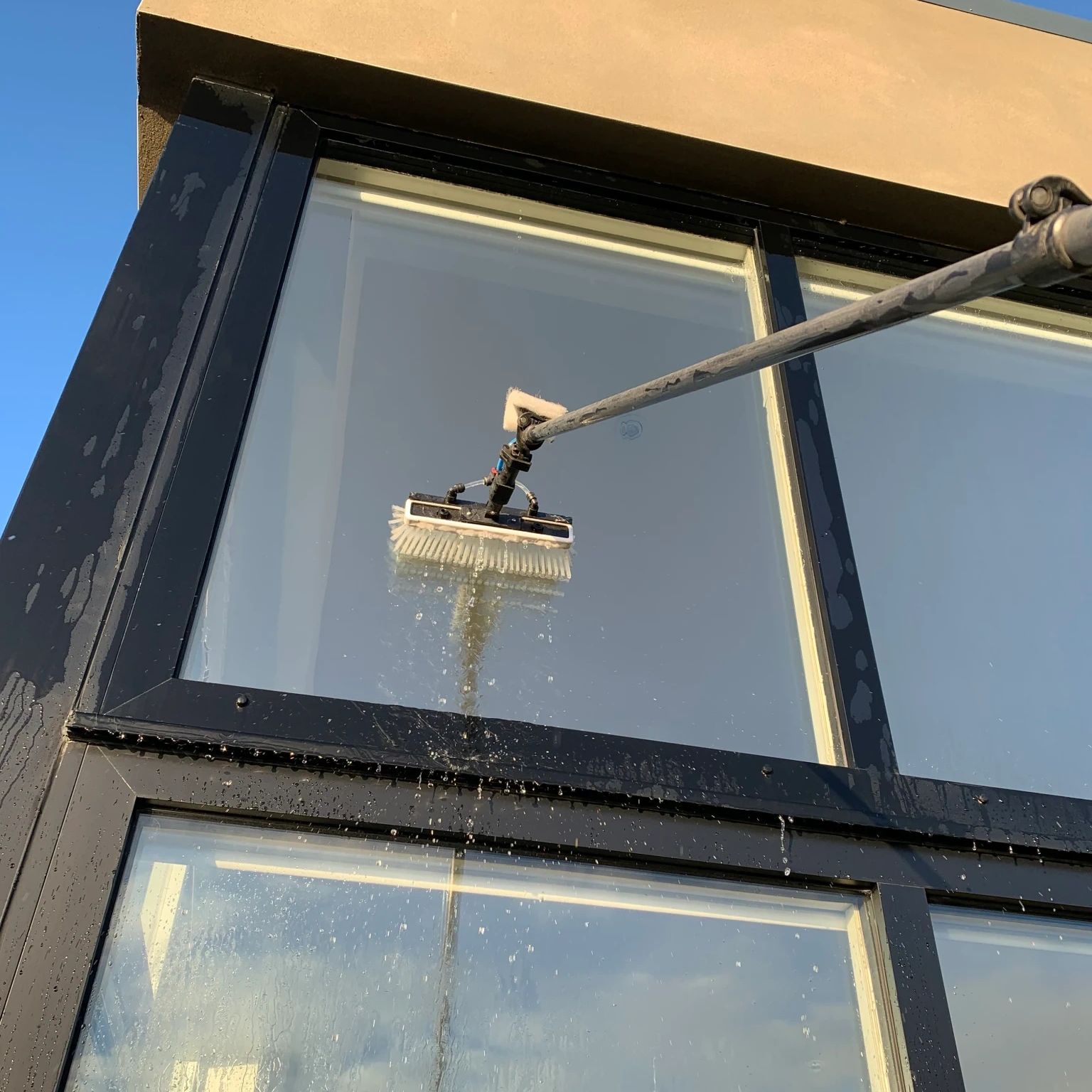 We use a $3,000+ pure water system with a water-fed pole. Pure 0 TDS water to avoid streaks and spots. We use this for high or oversized windows.